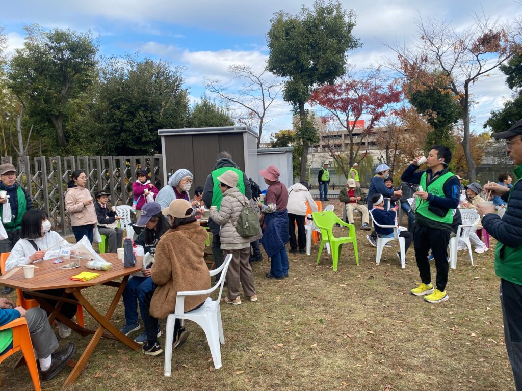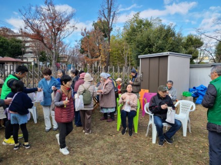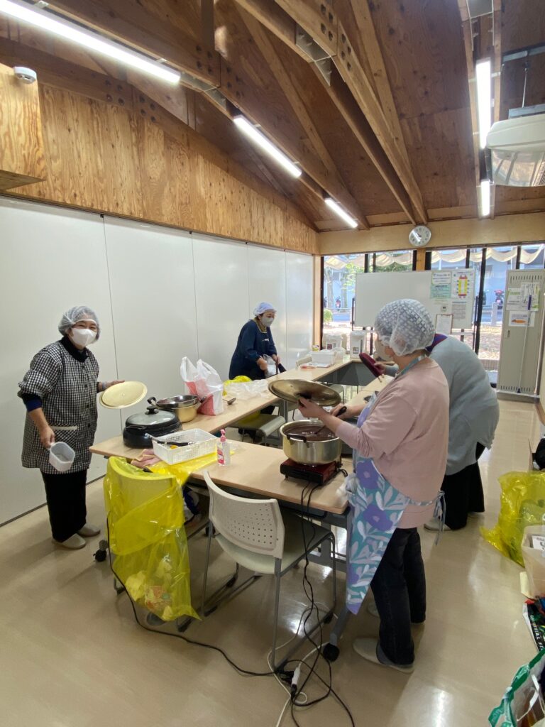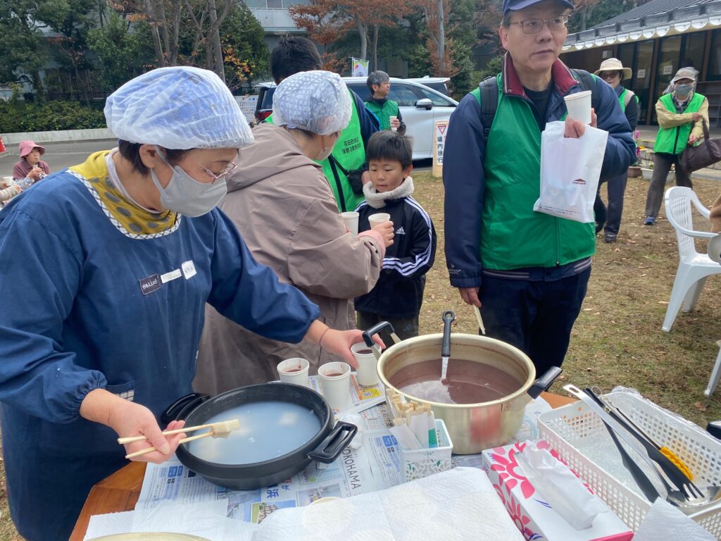 参加者全員が元気に完走し、ゴール後には、保活の皆さんがご用意くださった参加賞(シャトレーゼのお菓子の詰め合わせ)が配られました。さらに、保活協賛のもと、社協・民児共が用意した温かいお汁粉を振る舞いました。