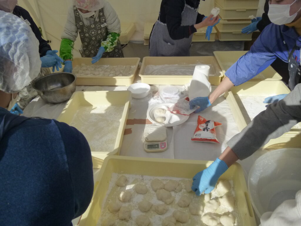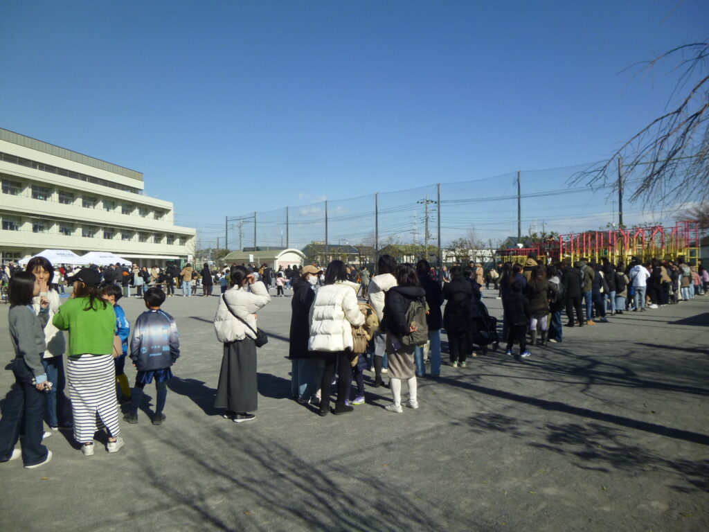 開催予定の11時前に行列ができ始め、餅つきも順調に進んでいたので販売を10分早めました。11時を過ぎると行列はどんどん長くなり今年も長い間お待ちいただくことになってしまいました。販売数量はお雑煮:331食、三色餅:607食で過去最高を更新しました。突風で舞い上げられた砂が臼に入り一部の餅を廃棄したこともあり餅の不足が懸念されたので最後の125食は餅の数を1つ減らし100円値下げして販売しなんとか皆さんに提供できました。